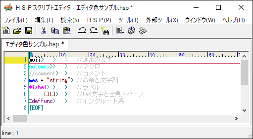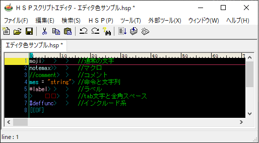 設定ファイルは以下からダウンロードできます。設定方法は「エディタ色サンプル.hsp」を参照してください。