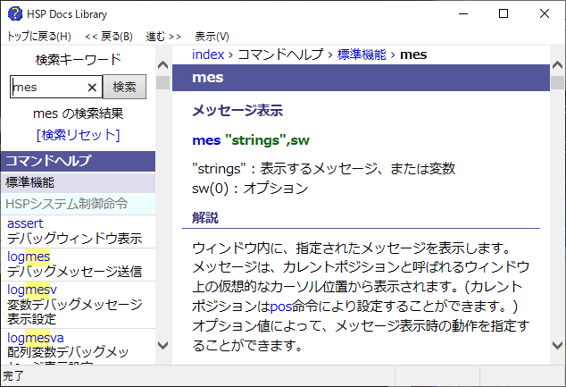 この”mes”という命令機能を詳しく調べてみましょう。