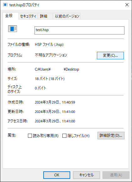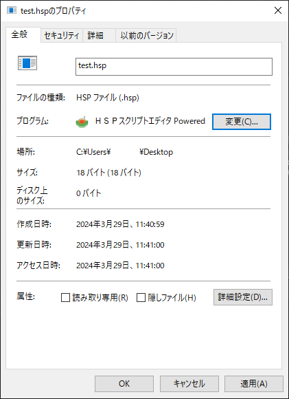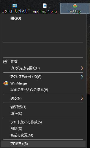 ".hsp"ファイルを右クリックし、プロパティを選択します。