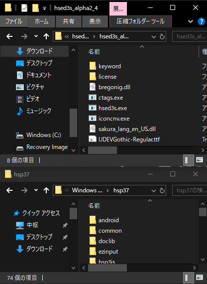ダウンロードしたファイル"hsed3s_(バージョン)"ディレクトリ内にある以下全てのファイルをHSPインストール先ディレクトリ("hsed3.exe"のある場所)にコピーします。